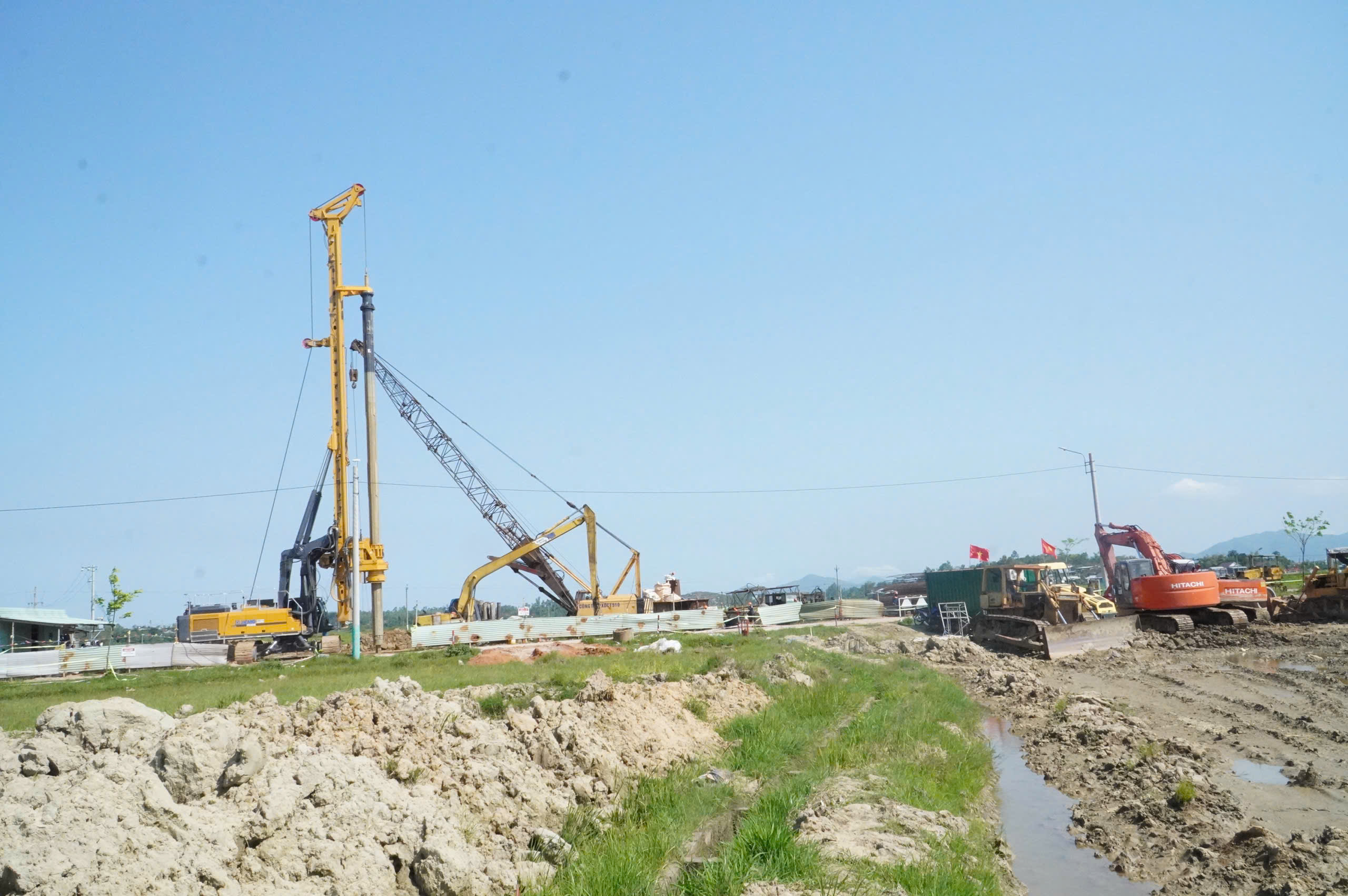 Ở các mũi thi công khác, máy khoan cỡ lớn liên tục hoạt động để thi công móng cầu, từng bước định hình tuyến cao tốc tương lai.